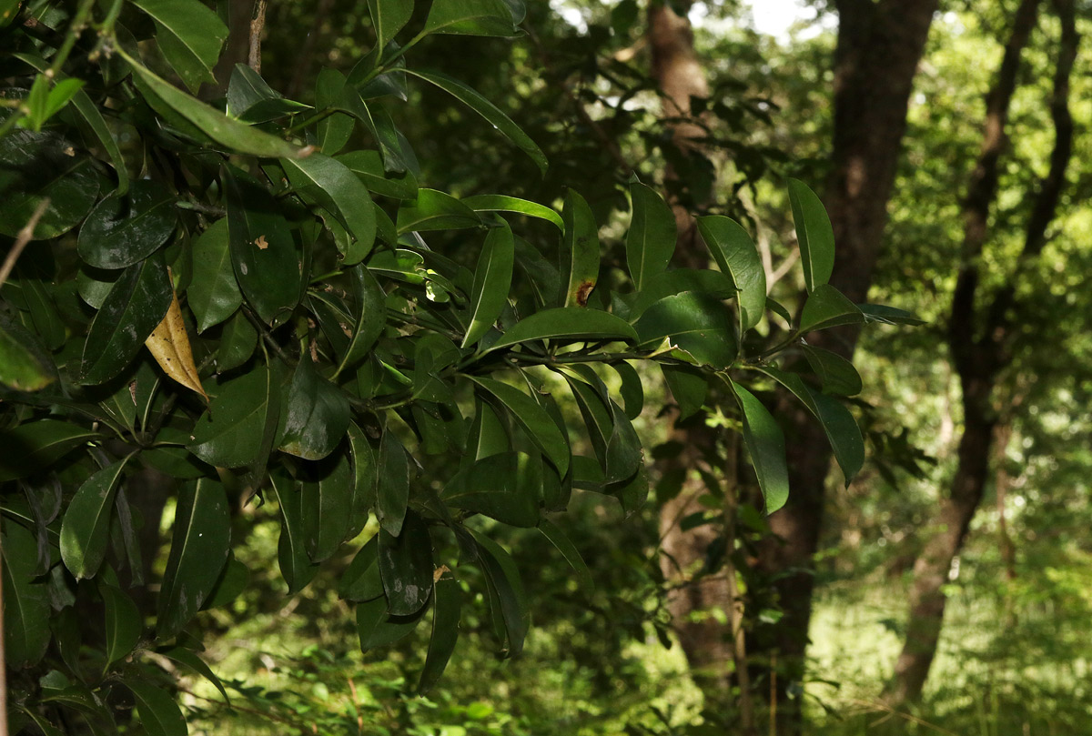 | Notes: | Small tree with opposite somewhat leathery, hairless leaves; bark pale grey, very rough and corky. Immature small green fruit present. |