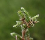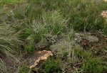 Stems creeping, branched, rooting freely, mat-forming. Leaves overlapping around stem and branches, monomorphic, 1.5-2.0 × 0.15-0.25 mm, greyish to greyish-green turning silvery grey when dry, narrowly oblong to lanceolate in outline, margins ciliate, tips tapering to a point, with a curved white hair-like seta, one third to a quarter of the length of the blade. Strobili rarely develop, 4-8 mm long, suberect, with sporophylls terminal in 2 ranks, broader and more lanceolate than the leaves, ciliate and tapering to a point. |