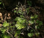 Rhizome shortly creeping, c. 4 mm in diameter; rhizome scales narrowly triangular, pale brown with a central dark stripe, 3-3.5 mm long. Stipe pale brown to strawcoloured, subglabrous with few brown hairlike scales. Fronds densely tufted, erect, weakly dimorphic, differing only in size and stipe length not in shape and degree of lamina dissection. Lamina flabellate, semi-circular in outline, dried lamina bent over sharply at an angle of 90° or more with the stipe. Sterile frond: stipe 2-10 cm long, lamina 1.5-4.5 cm long, dichotomously divided into 20-60 linear segments, segments apices serrate with 2-5 teeth, margins entire, usually reflexed. Fertile frond: stipe 5.5-20 cm long, lamina 3-7 cm long, otherwise similar to sterile lamina. Sori in submarginal lines, partly obscured by reflexed margin; indusium continuous. |