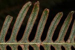 Rhizome erect to prostrate, up to 15 mm in diameter; rhizome scales lanceolate, brown with dark central stripe, up to 3 mm long, ciliate. Fronds tufted, arching, slightly coriaceous. Stipe up to 60 cm long, strawcoloured to dark brown, glabrous. Lamina up to 1 × 0.8 m, ovate in outline, deeply 2-pinnatifid, basal pinnae basiscopically developed. Pinnae narrowly lanceolate, pinnatifid; ultimate lobes narrowly linear, apices rounded, margins entire; veins free, no veins anastomosing below the sinus; glabrous on both surfaces, single spine present along the costa at the junction of the costules on the uppersurface only. Rhachis glabrous, smooth. Sori linear, continuous, marginal; indusia entire, membranous. |