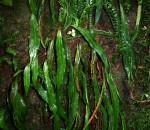 Rhizome widely creeping, slender, 1-2 mm in diameter, roots with short brown hairs; rhizome scales dark brown, narrowly lanceolate, 1-3 mm long, hairpointed. Fronds spaced apart, simple, thickly coraceous. Stipe a narrow winged extension of the lamina. Lamina up to 42 × 3.8 cm, glabrous on both surfaces, elliptic in outline, apex pointed, base tapering, margins entire, midrib sunken, veins obscure. Sori elongated, linear, 6-30 × c.2 mm, set at an angle of c. 15% to the midrib, exindusiate, without paraphyses. |