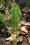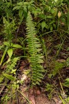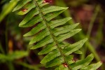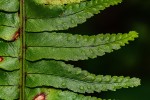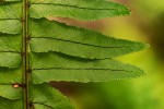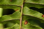 Rhizome short, erect, with long stolons, in places producing elliptical tubers, up to 25 mm long, from which new plants arise. Fronds few, tufted, erect, herbaceous. Stipe up to 16 cm long, brown, with sparse narrowly lanceolate, entire, brown scales up to 4 mm long, glabrous with age. Lamina up to 90 × 11 cm, narrowly elliptic to lanceolate in outline, pinnate, lower pinnae gradually reduced. Pinnae sessile, articulated, closely spaced or overlapping, narrowly oblong in outline, base cordate and auricled or lobed on the acroscopic side, overlapping on to the rhachis, apex rounded to pointed, both surfaces glabrous, margins entire or crenate, veins free, ending in an inconspicuous submarginal hydathode. Rhachis straw-cloured to pale brown, glabrous to subglabrous. Sori c. 1.5 mm wide, semi-lunulate, set in a submarginal line along both sides of the pinnae; indusia facing the margin, semi-lunulate, membranous, entire. |