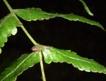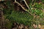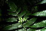 Rhizome erect to suberect. Fronds tufted, arching, proliferous on the rhachis near the apex, herbaceous. Stipe up to 60 cm long, pale brown, hairless, with a swollen aerophore at the base. Lamina up to 1.8 × 0.5 m, ovate-lanceolate to linear-oblong in outline, pinnate, apex with terminal pinna narrowly deltoid, lobed, lower pinnae hardly reduced in size, somewhat deflexed. Pinnae narrowly oblong, sessile, base truncate, apex long and abruptly tapering to a point, margin shallowly incised into broadly oblong, rounded, entire lobes with 4-5 pairs of veins meeting below the sinus; undersurface sparsely set with short white hairs on costae, costules and veins, upper surface with sporadic pale hairs. Rhachis pale brown, hairless, kinked where the gemmae emerge. Sori round, small, situated close to the costules in the basal half of each lobe; exindusiate. |