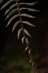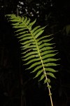 Rhizome erect, c. 20 mm in diameter; rhizome scales up to 4 mm long, brown, broadly lanceolate, entire. Fronds tufted, arching, not proliferous, herbaceous to subcoriaceous. Stipe up to 50 cm long, pale brown, thinly set with minute white hairs and with brown scales near the base. Lamina up to 1.2 × 0.45 m but average half this size, ovate-lanceolate in outline, 2-pinnatifid, basal pinnae gradually reduced and deflexed but not forming a series of much-reduced pinnae down the stipe. Pinnae narrowly oblong, attenuate, pinnatifid, ultimate lobes narrowly oblong, slightly falcate, apex acute to sharply rounded; both surfaces thinly set with hairs, more so along the costae and costules; veins 1 pair meeting in the sinus between the lobes. Rhachis pale brown, thinly pilose. Sori round, up to 16 per lobe; indusia subcircular to kidney-shaped with slender white hairs. |