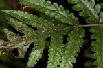 Rhizome erect, up to 2 cm in diameter; rhizome scales dark brown with paler margins, lanceolate in outline, entire, tapering to a point, up to 9 mm long. Fronds tufted, arching, thinly herbaceous, up to 1.8 m long, with proliferating buds on rhachis, costae and costules on the upper surface. Stipe 30-75 cm long, straw-coloured to brown, shiny, thinly set with minute white hairs and with scales similar to those on the rhizome at the base. Lamina 30-100 × 23-80 cm, ovate-triangular in outline, 2-pinnatifid to 3-pinnate with long pinnatifid terminal segment, basal pinnae longest and strongly developed basiscopically, sparsely set with minute white hairs on both surfaces, denser on costae and costules and veins below. Ultimate segments oblong-lanceolate, falcate, margins crenate or incised into rounded lobes. Sori up to 2 mm in diameter, round, in regular rows on both sides of the costules; indusia kidney-shaped, c. 1 mm in diameter, brown, membranous. |