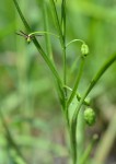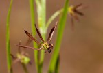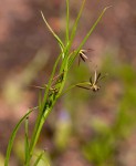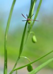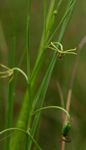 Slender perennial herb, growing from a small ovoid corm. Leaves spiralled along the stem, linear, often tubular near the base. Flowers small, axillary, appearing up-side-down. perianth segments filiform, spreading pale greenish-brown. Ovary longer than stamens. Style with 3 brown, papillate stigmatic branches. Fruit a ribbed oblong capsule. |