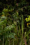 Perennial herb, 65-200 cm high, growing from a short, thick, vertical rhizome with extensive thick fusiform roots. Leaves 4-7 in a basal rosette, oblong-lanceolate, 25-80 cm long, hairless, sheathing at the base, often pseudo-petiolate. Inflorescence a lax panicle, up to 80 cm long (excluding peduncle). Pedicels articulated above the middle, lower ones 4-9 per node, up to 30 mm long in fruit. Flowers greenish, urn-shaped; tepals narrow, 3-veined,scabrid on the margins. Stamens shorter than the perianth; filaments longer than anthers; style more or less as long as stamens. Capsule obovoid, shallowly deltoid, 5-9 mm long. |