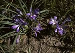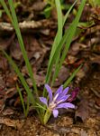 Low growing perennial, 10 - 20 cm, with a subterranean stem growing from corms, sometimes forming clumps. Leaves 4-7, linear, up to 25 cm, plicate with hairs on the ribs. Leaves normally overtopping the flowers. Flowers arising from the underground stem, large, 5-12 cm in diameter, pale to dark blue or mauve, with a white streak in the lower tepals, rarely all white. |