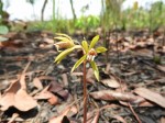 Slender terrestrial herb up to 28 cm tall. Leaf solitary, prostrate, appearing after the flowers are finished, broadly ovate, up to 12 × 11 cm, cordate, acuminate, grey-green above, often purplish below, somewhat pleated along the veins with toothed ridges along the pleats. Inflorescence 2-3(6) flowered at the end of an erect flowering stem. Petals and sepals similar, yellowish-green, linear lanceolate, 1.4-2 cm long. Lip whitish, heavily streaked with purple-brown, 3-lobed; side lobes erect; midlobe c. 10 mm wide, reflexed. |