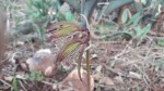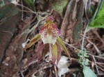 Erect terrestrial herb up to 45 cm tall. Leaf solitary, erect, appearing after the flowers are finished, ovate to almost round, up to 16 × 11 cm, truncate or slightly cordate at the base, obtuse to acute at the apex, green on both surfaces, pleated with 6-10 veins; petiole 5.5-17 cm long. Inflorescence (1)2-3-flowered. Petals and sepals similar, greenish-yellow with reddish veins and tinge, linear lanceolate, 25-45 mm long; petals slightly shorter than sepals. Lip 20-40 mm long, cream to pale yellow, with prominent purple-red veins, 3-lobed; mid-lobe vate, reflexed, with 2 parallel fleshy ridges; side lobes oblong, erect, enclosing the column. |