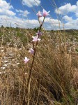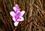 Erect epiphytic, lithophytic or terrestrial herb, with clustered conical pseudobulbs 1.5–5 cm long, 5–10-leaved. Leaves distichous, linear grass-like, 8–20 cm long, deciduous and often absent at flowering time. Flowers borne on old pseudobulbs when plants are leafless; inflorescence up to 80 cm long but usually much less, with 1 to several short well-spaced branches well spaced out on the rhachis, each several-flowered. Flowers showy, opening wide, shell-pink to mauve-pink, sometimes almost white, sometimes with red or lilac spots on the lip. Dorsal sepal oblong, 5.7–12 mm long; lateral sepals obliquely oblong-lanceolate, 7–11.5 cm long. Petals oblong to obovate, 5.8–11.6 mm long. Lip ovate-oblong, entire, slightly recurved, 7–11 mm long, with a yellow, slightly pubescent, longitudinal callus in the basal third. Capsule cylindric, 4–4.5 cm long and 3–4 mm wide.