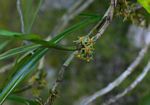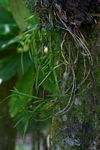 Epiphytic herb, normally pendent. Pendent stems usually bare, except for sheaths of old leaf bases and 3-6 fresh leaves at the apex. Leaves linear with 2 distinctly unequal lobes at the apex. Flowers along the stem in short clusters of 2-6(10), yellowish-green to straw-orange. Lip 3-lobed for about half the length. |