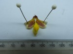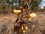 Terrestrial herb 26-100 cm tall growing from irregular asymmetrical tubers, c. 3-6 x 2-5 cm; leaves 2-4, 18 -50 x 0.7-2 cm, linear, fleshy, leaves absent at flowering time; inflorescence laxly few to many flowered; scape purplish with several sheaths; sepals purple-brown, petals yellow flushed with red-brown and heavily veined with red on the inside, lip yellow with side lobes veined red on inside, spur red-brown; bracts 8-13 mm long, linear, acuminate; ovary and pedicel 10-20 mm long, purple; sepals all similar, oblanceolate, apiculate 8-13.5 x 4-6 mm; petals 13-19 x 12-19 mm, suborbicular to elliptic-ovate, apiculate, held horizontal; lip 16-26 mm long and hard to flatten, 3-lobed; mid-lobe 8.5-12.5 x 7-9 mm, with a callus of 5 ridges, convex, elliptic-obovate obtuse or apiculate; side lobes erect, joined to base of column; spur 6-9 mm long (13-16 mm long to apex of ovary), conical-cylindrical from a wide mouth, horizontal or slightly deflexed. |