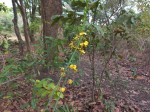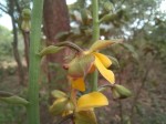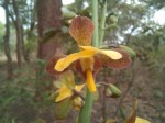 Tall terrestrial (up to 150cm). Pseudobulbs are well-developed and at least partly above ground. Leaves large, lanceolate and ribbed, present but not fully developed at flowering time. Inflorescence many-flowered. Flowers mostly facing down; sepals yellow-green with purple spots on the outside, mostly purple inside; petals bright yellow outside, creamy yellow inside. The lip is yellow with purple side-lobes and a purple-red spur. |