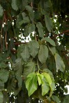 Medium to large tree. Bark pale grey, rough and flaking in to squarish pieces. Leaves elliptic to oblong with an acuminate tip, dark green with conspicuous yellowish midrib and veins; base more or less cordate. Flowers unisexual on different trees. Male spikes much longer (8-20 cm) than the female (2-3 cm). Fruit fleshy, ellipsoid, mulberry-like, brown when ripe. |