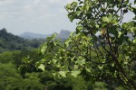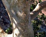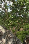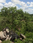 Small deciduous tree commonly growing as a lithophytic rock-splitter. Bark pale yellow to cream, smooth and flaking. Leaves very broadly ovate to kidney-shaped, often broader than long, up to c. 10 cm long, light green with long silvery hairs above, densely silvery velvety below, particularly when young; base broadly cordate; margin entire to irregularly and markedly wavy. Fruits in pairs in the leaf axils or on bare branches below the leaves, subsessile, almost round, 8-11 mm in diameter, covered in small small warts, green to reddish when ripe. |