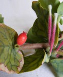 Parasitic shrub. Leaves opposite, subsessile, leathery, hairless, grey-green to blue-green, ovate, with 3-9 pairs of spreading veins, cordate at the base, basal lobes sometimes clasping the branches. Flowers in axillary c. 4-flowered clusters; corolla tube 3-4 cm long, dull red; lobes green; heads of buds, darkening, before opening, velvety to woolly hairy. Fruit an ellipsoid berry, c. 8 × 7 mm, finely velvety, crowned with the persistent calyx. |