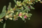 Prostrate, mat-forming herb. Stems reddish-brown, up to 1 m long, becoming somewhat woody at the base. Leaves subsessile, elliptic, oblong to linear-oblong, 5-13 mm long, leathery and hairless, dark green to reddish-brown; midrib conspicuous; margin rolled under. Ocrea silvery hyaline, c. 5 mm long, deeply frilled, hairless. Flowers c. 3.5 mm long, greenish-white with creamy-white, pinkish-white or pinkish-red lobes, in numerous 1-5-flowered, axillary clusters, surrounded by leafy bracts. Nut 1.2-2 mm long, trigonous with concave sides, smooth, black and shiny. |