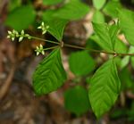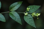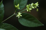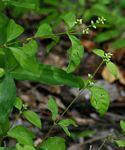 Woody, shrubby perennial, 0.5 - 2 m. Young branches quadrangular, covered in yellowish, subappressed hairs. Leaves opposite, ovate to elliptic-oblong, 2-10 cm long, finely pubescent on both surfaces; apex mucronate; margin entire. Flowers in short terminal and axillary spikes, greenish-white. Capsule oblong-ovoid, c. 2.5 mm long. |