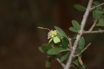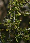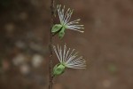 Small woody shrub up to 2 m tall with stiff rigid branches. Leaves clustered on dwarf side shoots or occasionally also alternate, simple, obovate, up to 2 cm long, grey-green, leathery, hairy; margin entire. Flowers solitary or in pairs on the side shoots. Sepals green; petals present but very small, white; stamens 15-25, c. 1.5 cm long. Fruit bean-like, pendulous, c. 5 cm long, somewhat constricted between the seeds. |
