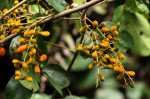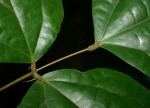 A twining liane or scandent shrub.Young branches, leaf-rhachis, and undersides of leaves with brownish stellate hairs, turning glabrescent with age. Leaves 3-foliolate, 3-veined from the base; petiolules swollen. Flowers in sweetly scented, terminal panicles, white, with the calyx densely covered in stellate and glandular hairs. Fruits obovoid, brown-red when ripe, covered in stellate hairs. Seeds with an orange aril.