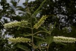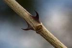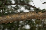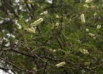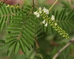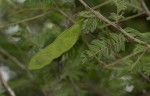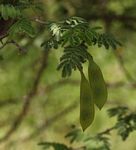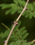 Multi-stemmed shrub or tree up to 10 m tall. Bark grey to creamy, smooth, sometimes flaking; branchlets densely velvety when young. Thorns sharply hooked, in pairs below the nodes, brown to blackish. Leaves with 6-20 pairs of pinnae, each with 12-30 pairs of small leaflets, greyish-green; petiole with a conspicuous, saucer-shaped gland near the base. Flowers in axillary spikes up to 6.5 cm long, white. Pods straight, flat, leathery, 6-12 cm long, hairless, dehiscent. |