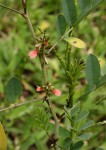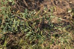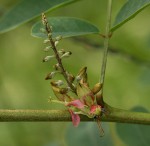 Small shrub, usually up to c. 1 m tall. Stems and branches slightly angular. Leaves imparipinnate with 5-7 pairs of leaflets; leafltes 14-20 mm long, sparsely hairy on both surfaces. Inflorescences axillary. Flowers reddish-pink and yellowish-green, with brownish hairs on the back of the standard. Pods strongly sickle-shaped, up to c. 20 mm long, hairy. |