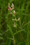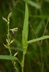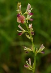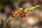 Erect or spreading procumbent perennial herb, up to 60 cm tall, often woody at the base. Leaves 1-foliolate, up to 6.5 cm long, variable in shape from ovate to oblong-elliptic and nore or less narrowly lanceolate, subcordate at the base, finely hairy with longer hairs above; veining conspicuous on both surfaces; petiole 4-15 mm long. Stipules lanceolate, 7-24 mm long. Inflorescences terminal and leaf-opposed, 2-13 cm long, usually fairly densely flowered. Calyx lobes pubescent. Standard orange, pinkish-buff or purple, often paler than wings and keel; wings mauve, keel magenta, mauve or green with a purple tip. Fruit 1.2-2.5 cm long, well exserted from the calyx, not constricted between the seeds; surface with raised reticulation, velvety. |