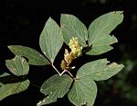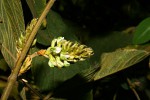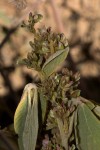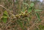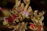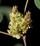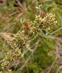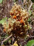 Perennial herb or woody subshrub, erect or subscandent, up to 2.5m high. Branches ribbed, covered with silky hairs when young. Leaves 3-foliate, up to 15 cm long, dull green above, pubescent and paler below, both surfaces with small reddish glands. Flowers in dense woolly clusters, greenish to creamy-white, sometimes with purple veining. Fruit a small inflated pod, up to 12 × 6 mm, covered in rusty-orange glands, leaving stains on touching. |