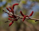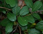 Shrub or small tree. Bark smooth, light brown to grey, flaking to reveal a powdery rufous-brown underbark. Leaves alternate, elliptic-ovate or elliptic-lanceolate, broadly rounded or notched at the apex, dark green above, brown hairy only when young, paler below, densely covered with golden gland dots and minute domatia in the axils of the veins; margins entire somewhat rolled under. Flowers unisexual on different trees, male flowers, reddish in catkin-like spikes up to 6 cm long; female flowers solitary, green with long velvety red, forked styles. Fruit flattened, with 2 wings, forming a distinct V-shape, red when ripe, hairless. |