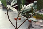 Medium to large evergreen tree. Bark grey with brown lenticels, smooth, cracking when older. Base of the trunk with conspicuous stilt-roots up to 2.5m long. Leaves alternate, spiralled, elliptic-obovate, usually up to 15cm long, sometimes larger, leathery, dark green above, paler below, hairless; veining conspicuous, looping before the margin; margin entire often somewhat rolled under. Petiole slender, 1-5cm long. Young leaves reddish-pink. Flowers among the leaves, greenish-yellow, sexes mostly on different trees. Fruit fleshy, spherical, 1.5-2 cm in diameter, yellow when ripe. |