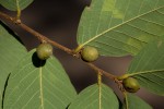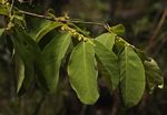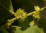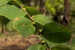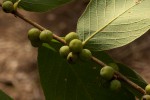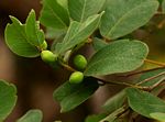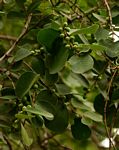 Shrub or small tree. Bark dark brown to grey, rough with longitudinal striations; young shoots densely velvety. Leaves alternate, ovate to obovate, 3 - 12 cm long, light green and densely velvety on both surfaces; lateral veins conspicuously parallel; apex rounded, often notched; margin entire but sometimes appearing scalloped between the veins. Flowers in tight axillary clusters, small greenish-yellow, unisexual on the same tree. Fruit a subspherical fleshy berry, c. 10 × 8 mm, black when ripe, edible. |