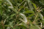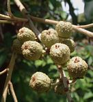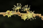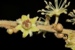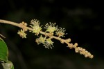 Shrub or small tree; trunk usually Y-forked with drooping branches; branches often in whorls of 3. Young twigs rusty to fulvous stellate-hairy. Leaves aromatic when crushed, elliptic, elliptic-lanceolate or narrowly oblong-lanceolate, 1.5–18 cm long, rounded to shallowly cordate at the base, with a pair of sessile to long-stalked basal glands on the lower surface, hairless and deep green to midgreen above (var. gratissimus), densely silvery-hairy with rusty spots or fulvous stellate-hairy beneath; midrib usually impressed above, prominent beneath; petiole up to 7 cm long. Racemes up to 15 cm long, terminal, with both male and female flowers or all male flowers. Flowers unisexual, creamy yellow, usually on the same tree and in the same inflorescence, rarely on different trees. Fruit subglobose and somewhat 3-lobed, 8–11 mm wide, densely greenish- or yellowish- to silvery-hairy with brown spots. |