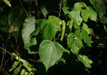 Medium to large tree. Bark pale grey, smooth with whitish horizontal markings; trunk often buttressed in large specimens; branches often armed with short spines. Leaves spirally arranged, broadly ovate, up to 20 × 25 cm, more or less deeply cordate and often peltate at the base, 5-11-veined from the base, densely golden-gland dotted below; margin glandular-dentate to almost entire. Flowers in branched racemose inflorescences, greenish to creamy-yellow, unisexual, on different trees. Fruit subspherical, rarely 2-lobed, up to 6 × 10 mm, covered in yellowish-green glands when young, smooth, hairless and green when ripe. |