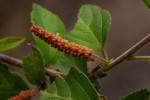 Deciduous scrambling shrub or small tree. Branches almost pendent. Leaves ovate-lanceolate to asymmetrically rhombic-lanceolate, 3-5-veined from the base, light green, somewhat pilose on both surfaces, particularly on the veins; margins crenate-serrate. Stipules linear-lanceolate, up to 9mm long, reddish-brown. Flowers unisexual on the same plant; male flowers in axillary racemes up to 6 cm long (image 6); female flowers in terminal spikes with conspicuous red styles (image 5), held in cupshaped, frilled bracts (image 3). Fruit 3-lobed, pubescent. |