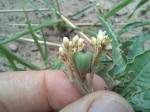 A multistemmed, pubescent, glaucous suffrutex, with a copious white, milky, latex; stems prostrate or straggling, up to 42 cm long, but commonly much less, branching from a scaly underground stem which arises from a tuber; tuber up to 10 cm in diameter and resembling a coconut in shape and size, lying 15–70 cm below ground level, with red flesh. Leaf blades 3–7.5(10) × 1–3 cm, lanceolate, acute at the apex, entire or crisped-undulate, cuneate to rounded or occasionally shallowly cordate at the base. Inflorescences terminating the short main axis, peduncle 1.5–3 cm long. Male flowers: pedicels short, extending to 3 mm at maturity; calyx 2–2.5 mm long, lobes 1–1.25 mm wide, triangular-ovate, subacute or obtuse, subentire, glabrous, green; petals 4–5 × 1.5–1.75 mm, spathulate-oblanceolate, rounded, glabrous without, pilose within below, cream-coloured, pale yellow, pale pink, whitish or greenish, carmine at the base. Female flowers: pedicels 2–3 mm long, stouter than in the male; calyx 4 mm long, lobes 2.5–3 × 1 mm, triangular-lanceolate, acute, entire, ciliate, pubescent; petals 6 × 2 mm, oblong-oblanceolate, glabrous, otherwise as in male; disk deeply 5-lobed, the lobes unequal, flattened, truncate; ovary 2 × 2 mm, 3-lobed to subglobose, pubescent; styles 3 mm long, united at the base, divaricate, stigmas bifid, rugulose. Female flowers: pedicels 2–3 mm long, stouter than in the male; calyx 4 mm long, lobes 2.5–3 × 1 mm, triangular-lanceolate, acute, entire, ciliate, pubescent; petals 6 × 2 mm, oblong-oblanceolate, glabrous, otherwise as in male; disk deeply 5-lobed, the lobes unequal, flattened, truncate; ovary 2 × 2 mm, 3-lobed to subglobose, pubescent; styles 3 mm long, united at the base, divaricate, stigmas bifid, rugulose. Seeds 6.8–7.2 × 4.4–4.9 × 3.5–4 mm, ovoid-ellipsoid, smooth, pale yellowish-grey, sometimes brown-flecked, with a large 2-lobed flabelliform caruncle 2 × 3.5–4.5 mm, chestnut at the base shading to buff. |