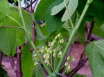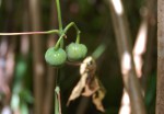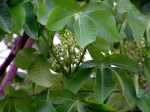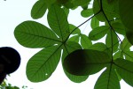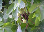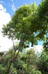 Completely hairless small tree with pale grey, smooth bark, often somewhat papery and peeling purplish-brown. Milky sap present. Leaves 3-5-lobed or rarely simple, 10-28 cm wide, more or less cordate at the base, dark bluish-green above,paler beneath; net-veining transparant against the light; petiole 7-13.5 cm long. Iflorescence branched, 2-15 cm long. Flowers unisexual with male and female flowers in the same inflorescence, greenish-white and mauve-tinged or pale yellow with reddish markings. Fruit globose, c. 2 cm in diameter, smooth but becoming tuberculate on drying. |