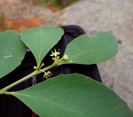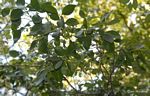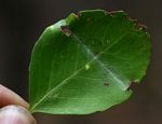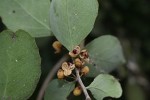 Multi-stemmed shrub or small unarmed tree. Bark grey-brown, smooth to finely fissured, flaking to reveal pinkish under bark. Leaves alternate, variable, ovate, elliptic-oblong to almost round, up to 13 × 9 cm, pale to dark green, paler below, somewhat leathery; margin more or less distinctly gland-toothed. The leaves typically show a whitish line when folded up (image 2). Flowers in small axillary clusters, pale greenish-yellow. Fruit a 3-lobed capsule, c. 5-7 mm in diameter, yellow to reddish-brown when ripe. |