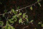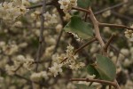 Shrub or rarely a small, multi-stemmed tree, armed with strong straight thorns, up to 8 cm. Leaves in fascicles, often on the spines, elliptic to obovate, 1-5 cm long, softly textured and finely hairy; midrib raised on both surfaces; margin shallowly crenate. Flowers in axillary clusters, often on the spines, white or cream, c. 1 cm in diameter. Fruit 3-lobed, c. 5 mm in diameter, persistent styles forming 3 points, orange-pink, dehiscent. |