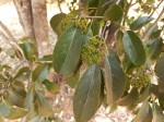 Tree 2–12 m high; branches 4-lined and wine-red when young, becoming terete with prominent whitish lenticels and eventually greyish. Leaves yellowish-green to dark green above, greyish-green beneath, oblong to elliptic or lanceolate, 3·5–13 cm long, leathery, yellowish venation more prominent above than beneath; margin obtusely glandular-denticulate or more rarely dentate or subentire; petiole 5–18 mm long. Inflorescences in subglobose, many-flowered axillary clusters; peduncle 3–25 mm. long. Flowers c. 4 mm in diameter, bisexual; Sepals 5, semicircular, c. 0.3 mm long, entire; petals 5, green to yellow, oblong or elliptic-oblong, 1–1·5 mm long; margin paler, entire. Stamens 5. Fruit a yellow or greenish-yellow drupe, drying dark red, subglobose to ellipsoid or obovoid, 13–18 mm long, smooth. |