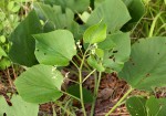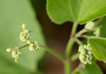 More or less woody climber or liane. Stems cylindric, with a short grey pubescence; tendrils 2-fid. Leaves, alternate, very broadly ovate to almost circular, up to 15 × 15 cm, widely cordate at the base, pubescent with short spreading hairs on both surfaces, particularly on the veins; margin finely toothed; petiole 2-8 cm long, densely pubescent; stipuls c. 3 × 3 mm, pointed at the apex. Inflorescences leaf-opposed, branched, on a peduncle up to 9.5 cm long, pubescent. Flowers small, greyish-green, densely pubescent. Fruit ovoid c 9 × 6 mm when dry, covered in thick soft hair-like processes. |