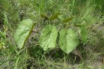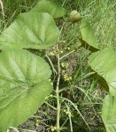 Erect shrublet from perennial rootstock, flowering before adult leaves are produced; whole plant except petals and ovary densely ferruginous-tomentose; stem cylindric. Tendrils usually absent. Leaves simple; petiole 4–18 cm. long; leaf-lamina up to 23 × 22 cm., circular to broadly ovate, apex obtuse, sometimes obscurely 3-lobed, margin dentate or sinuate-dentate, base deeply cordate; stipules up to 15 × 8 mm., densely pubescent outside, glabrous within. Cymes leaf-opposed; peduncle 2–4 cm. long; pedicels congested, 4 mm. long, lengthening to 10 mm. in fruit; bracts and bracteoles up to 4 mm. long. Flower-bud 3 mm. long, puberulous towards apex. Calyx 1 mm. long. Petals purple. Ovary glabrous; style 1 mm. long; stigma subcapitate. Fruit 9 × 6 mm., glabrous. |