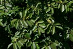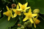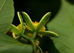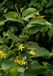 Usually a shrub, sometimes a small tree. Bark smooth, pale grey; young branches with soft woolly stellate hairs. Leaves alternate, oblong-obovate, 5-18 cm cm long, 3-veined from an asymmetric base, often abrubtly pointed at the apex, green and nearly hairless above, paler and finely greyish hairy between the veins beneath; margin toothed: petiole up to 1 cm long, with small tufts of stellate hairs. Flowers in 2-3-flowered axillary clusters, c. 3 cm in diameter, bright yellow, showy in profusion. Flower stalks and back of the sepals with distinct small scattered tufts of short rusty hairs. Fruit almost completely divided into 2 separate spherical lobes, each part up to 1.3 cm in diameter, yellow when ripe. |