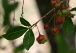 Shrub or small tree. Leaves obovate to oblanceolate with numerous lateral veins; margin densely toothed. Flowers in few-flowered axillary clusters, bright yellow, very short-lived. Fruit 4-7 ovoid drupes, surrounded by the bright-red persistent sepals, often folded over the developing fruits at first.