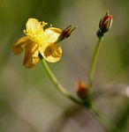 Erect perennial herb, occasionally annual, up to 70 cm tall, occurring in wet grassland and swampy places. Stems quadrangular without dark glands. Leaves lanceolate, sessile, clasping around the lower stems, margin recurved. Flowers terminal, solitary or in lax heads, yellow to pale orange with red markings, the petals rolling up in the heat of the day. Fruit a small capsule.