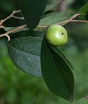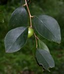 Small to medium-sized unarmed tree. Bark grey to blackish, peeling in older specimens; branchlets pale with lenticels. Leaves, elliptic to ovate-elliptic, 5-12 cm long, leathery, glabrous, dark green on both surfaces; margin entire or obscurely dentate with widely spaced teeth. Flowers axillary, solitary or in few-flowered clusters, small, greenish-white. Fruit subspherical, 1.5-2.5 cm in diameter, sharply tipped, fleshy, yellow when ripe. |