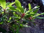 Small to large evergreen tree with a straight stem, sometimes fluted at the base in large specimens. Leaves are crowded near the end of branches, elliptic to oblanceolate up to 15 cm long, leathery, hairless, with translucent dots and streaks; margin entire; petiole 5-10 mm long, typically pink to red, turning purple-brown in older leaves. Flowers are borne in small inconspicuous clusters, axillary along the branches, greenish-yellow. Fruit a globose, 1-seeded drupe, 3-5 mm in diameter, purple, borne on the previous year's wood.