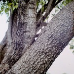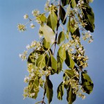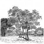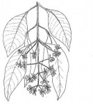 Shrub or small deciduous tree with a drooping appearance. Bark rough and deeply fissured. Leaves opposite, elliptic, shiny yellowish green, pointed at the apex; pale yellow midrib and lateral veins conspicuous. Flowers white to cream in loose clusters near the ends of branches, sweetly scented. Fruit often in paired, woody, boat-shaped pods, beaked at the apex, dark brown, heavily dotted with pale lenticels. |