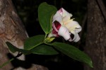 Usually a true liana without tendrils, occasionally a scrambling shrub. Stems and branches often with triangular corky knobs; latex white. Leaves opposite, elliptic or ovate, up to 13.5 × 6.5 cm, dark green above much paler below with 3-8 pairs of lateral veins, hairless. Flowers normally appearing after the leaves, 1-3 per inflorescence. Corolla white and red, streaked with purple; lobes ovate, tapering to a point but without long linear tails. Fruit in 2 widely diverging follicles, sometimes at an angle of more than 180°, each 12-26 cm long, 3-4.5 cm wide, dark grey to purple-black, hairless, covered in lenticels. |