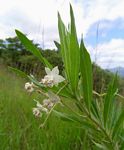 Robust perennial herb, up to 2.5 m tall. Stems usually single, branching near the top, upper parts with spreading white hairs. Leaves opposite, sometimes sub-opposite or crowded near the ends of branches, narrowly oblong to lanceolate, 4-12 cm long, mostly hairless except for soft white hairs on the midrib and margins. Flowers in extra-axillary, 5-12-flowered, nodding umbels. Corolla strongly reflexed, white. Corona lobes attached 1.5 - 2 mm above the base of the staminal column, white, tinged pink, mauve or purple, laterally compressed, as tall as the column. Follicle more or less erect on a twisted pedicel, spherical to subspherical, often somewhat depressed on one side, distinctly inflated, not beaked, covered in soft bristles. See Gomphocarpus fruticosus for comparison. |